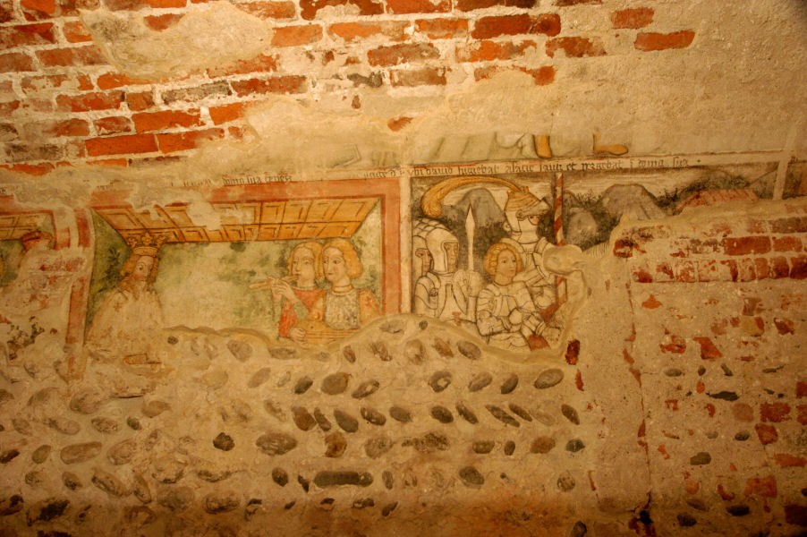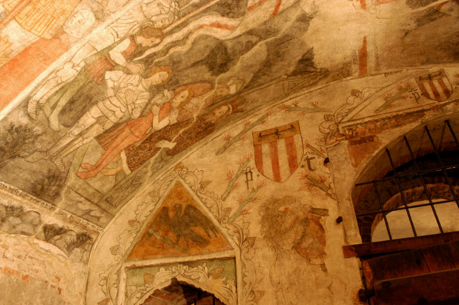 superiori degli affreschi sulle pareti lunghe, qualche lacerto sulla parete di